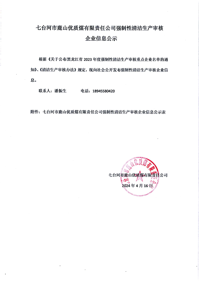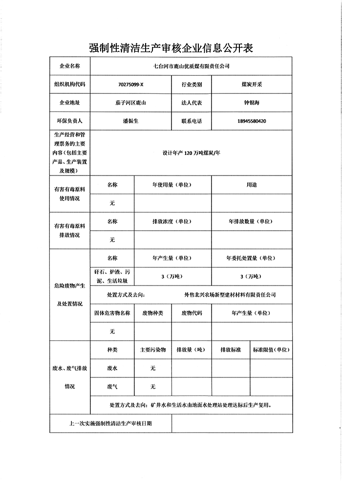 七臺(tái)河市鹿山優(yōu)質(zhì)煤有限責(zé)任公司強(qiáng)制性清潔生產(chǎn)審核企業(yè)信息公示
